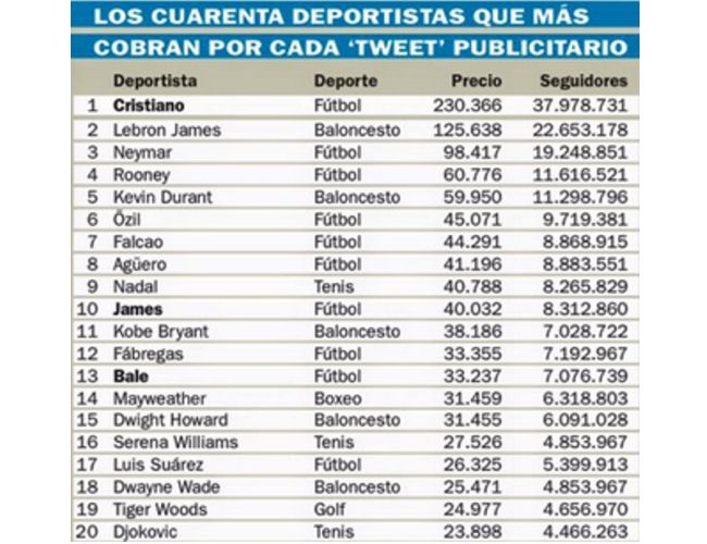 Ya se informó que Cristiano Ronaldo es el deportista con el valor más alto de tuit publicitario. Según un estudio de Opendorse, el portugués del Real Madrid recibe 230 mil euros (o 250 mil dólares) cada vez que promociona alguna marca o producto para sus 37 millones de seguidores en Twitter.