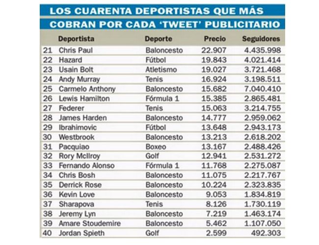 Mirá en la galería el valor de un tuit en cada uno de los mejores deportistas (valor en euros)