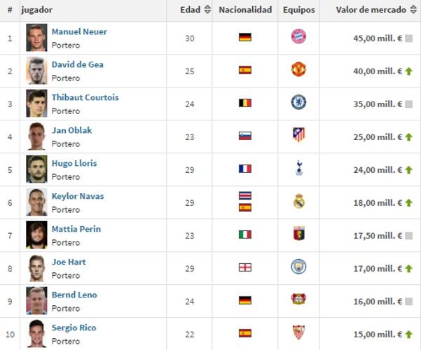 En el primer puesto, un indiscutible Manuel Neuer, con un valor de mercado estimado en 45 millones de euros, seguido por David De Gea, 40 millones, y con Thibaut Courtois completando el podio con sus 35 millones.