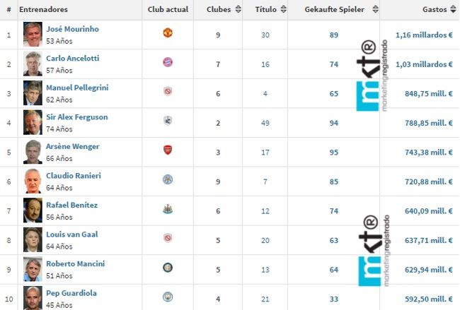 Con José Mourinho a la cabeza, les presentamos a continuación el ranking de los 10 entrenadores que más dinero gastaron en fichajes, hasta el día de hoy.