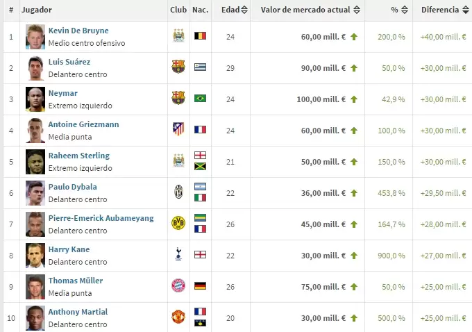 Otro de ellos fue Luis Suárez, con un espectacular 2015 y un gran inicio de 2016. El uruguayo costaba 60 millones de euros y ahora posee un valor de 90 millones, siendo este un aumento del 50%.