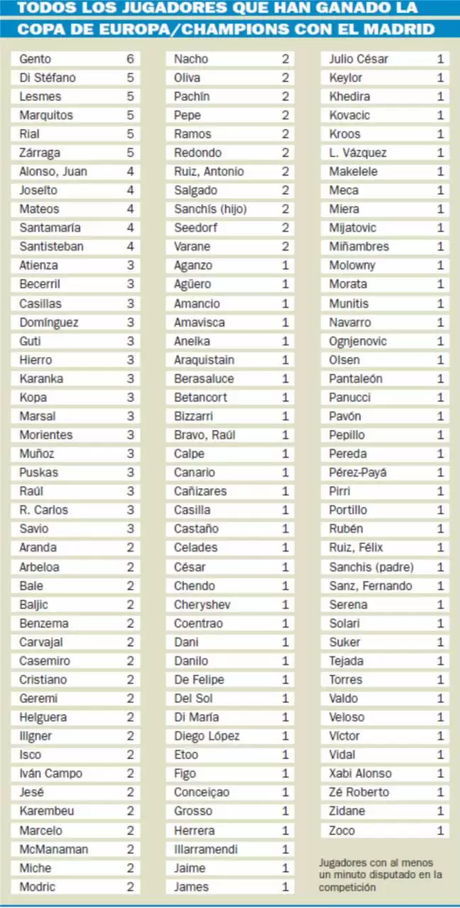 Desde Zinedine Zidane, con una Champions como jugador, hasta Gento, con seis, son muchísimos los jugadores que han conformado un plantel del Real Madrid campeón de la Orejona.
