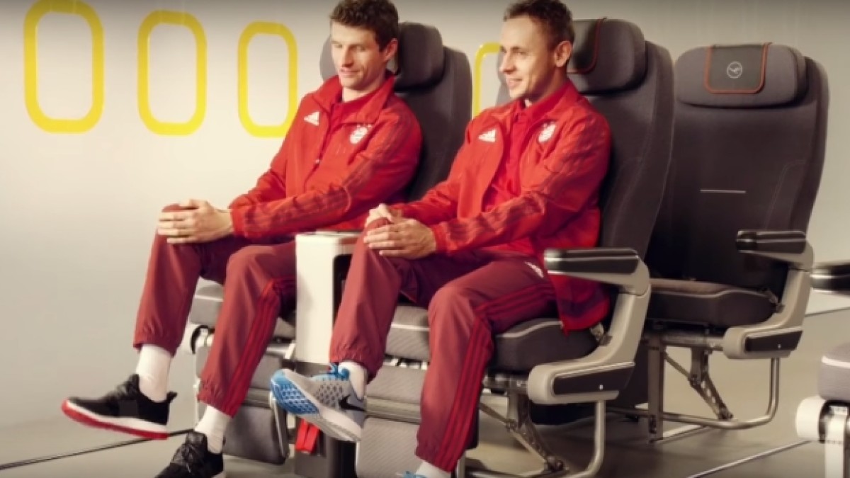 Thomas Müller y Javi Martínez, entre otros jugadores del Bayern Munich, son los protagonistas del comercial Flyrobic producido a partir del vínculo del club alemán con la aerolínea Lufthansa.