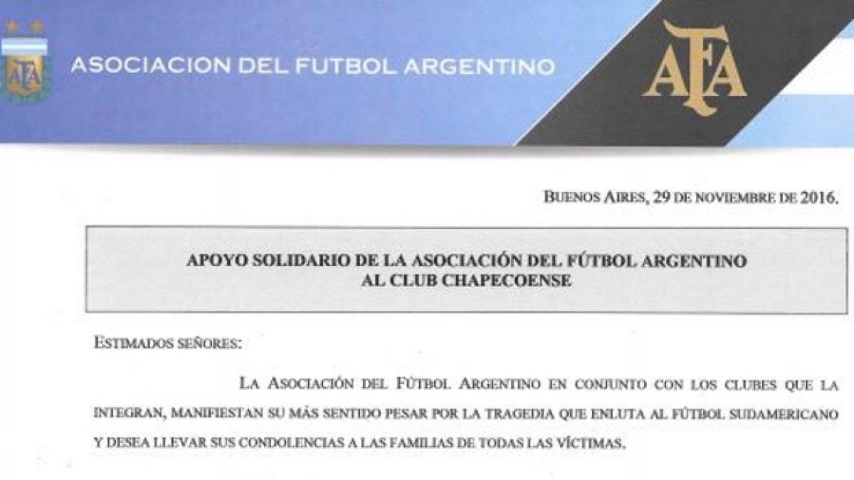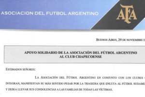 “La Asociación del Fútbol Argentino, en conjunto con las instituciones que la integran, le tiende la mano al Club Chapecoense y a toda la comunidad de Chapecó, que enfrentan una tragedia irreparable y merecen la solidaridad de las Federaciones hermanas. Es por eso que los clubes ponen a disposición la cesión de futbolistas para aportar a la reconstrucción de un plantel que será honrado por todos”, explicó a través de un comunicado.