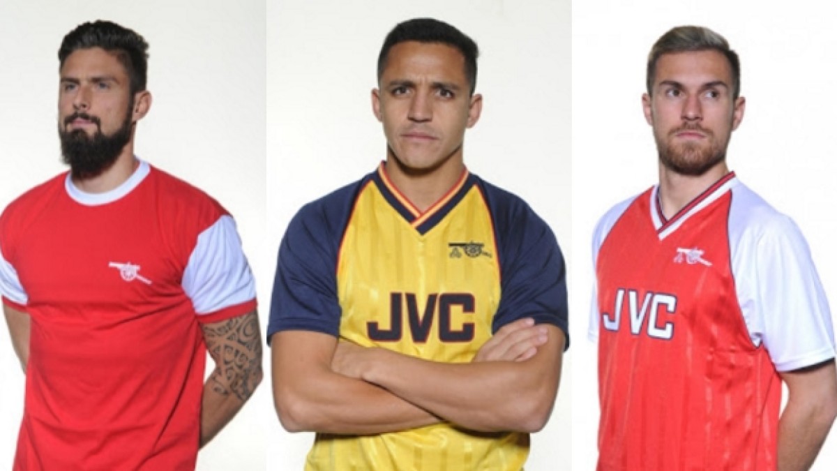 En las fotos que se conocieron, se lo ve a Oliver Giroud con la remake de la camiseta de la temporada 1970-71 y a Aaron Ramsey y Alexis Sánchez con las dos prendas de la temporada 1988-89.