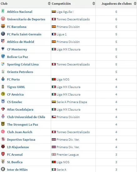 Entre todos los clubes que aportan jugadores para la Copa América Centenario, hay dos que se destacan. Se trata del Atlético Nacional de Medellín y de Universitairo de Perú, quienes con seis jugadores cada uno, son los equipos con más representantes.