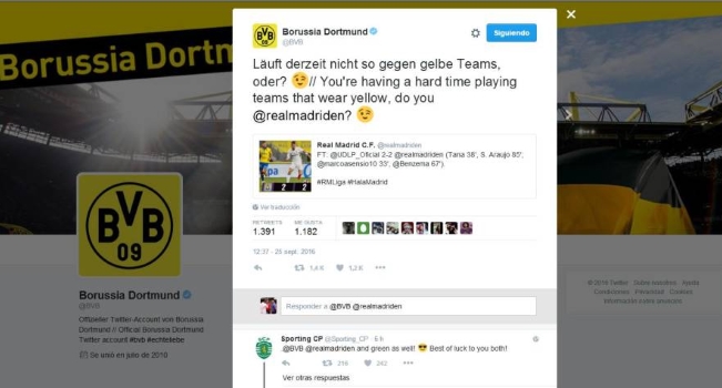 Esto llevó a que el equipo teutón tuiteará "¿Están pasando una mala racha contra equipos que visten de amarillo no, @realmadriden?". Luego, sin respuesta de los españoles, se sumó el Sporting Lisboa portugués, que igualó 1 a 1 contra el Madrid en la jornada inaugural de Champions. "Y también contra los de verde", agregaron.