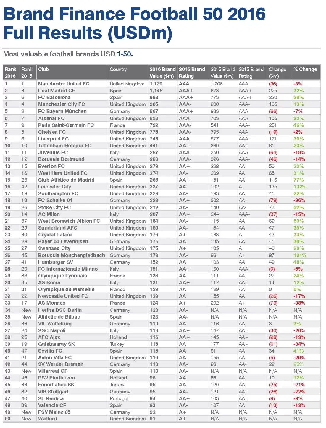 Se presentó la edición 2016 del prestigioso informe Brand Finance Football, que da cuenta de los 50 equipos más valiosos del fútbol mundial.