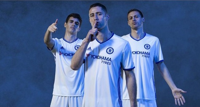 La nueva tercera camiseta del Chelsea es blanca, con el cuello azul, al igual que las tres tiras ubicadas en los laterales.