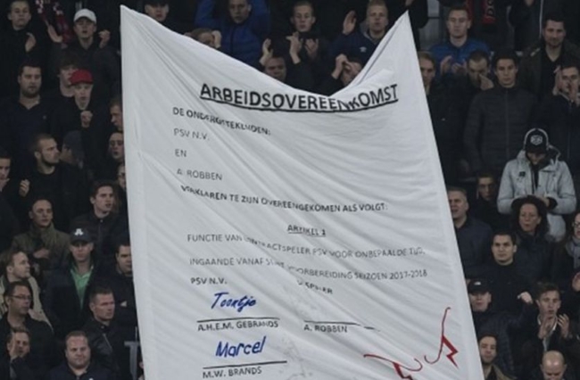 En el partido entre PSV frente al Bayern Munich, los fanáticos del PSV llevaron una bandera con forma de contrato para que Robben regrese al club. El delantero, como agradecimiento les regaló su camiseta.