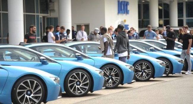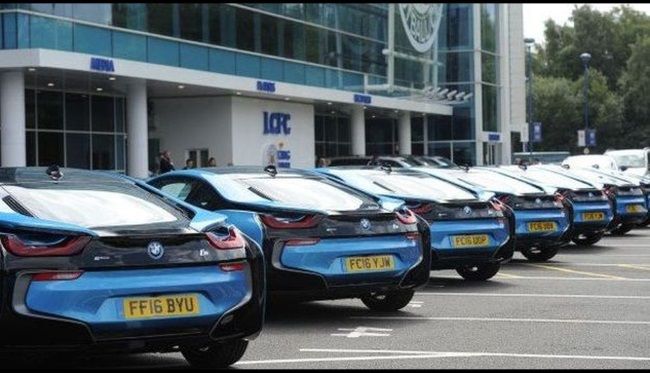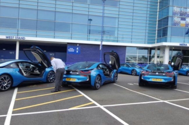 19 BMW i8 estuvieron estacionados en la puerta del King Power Stadium del Leicester City, como premio de Vichai Srivaddhanaprabha, dueño del club, a los campeones de la pasada Premier League.
