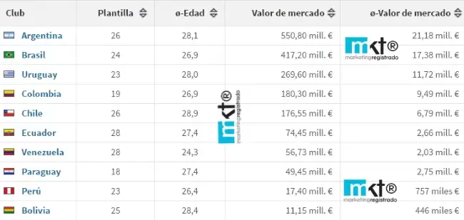En el otro extremo de la lista, aparece Bolivia con su plantel apenas valuado en 11.1 millones de euros.