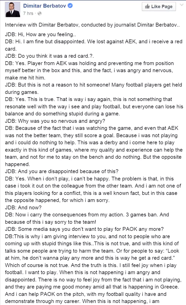 El ex jugador del Manchester United, el búlgaro Dimitar Berbatov, decidió autoentrevistarse en su Facebook oficial a raíz de las críticas que recibió por una expulsión en el PAOK Salonica, su nuevo club.