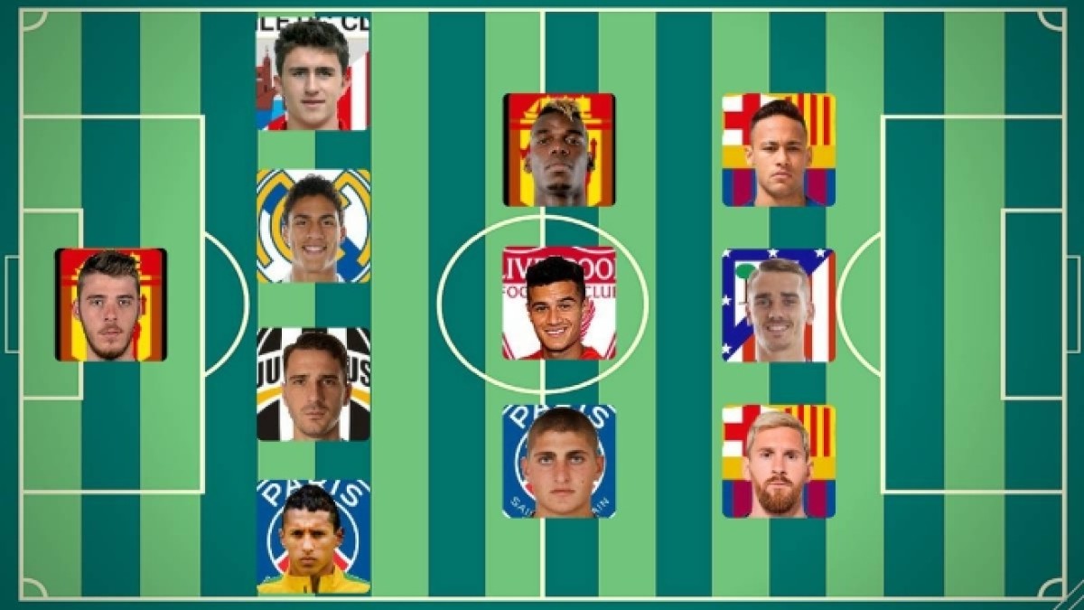 De Gea (58) en la portería; Marquinhos (47), Bonucci (50), Varane (50), Laporte (48); Verratti (72), Coutinho (75), Pogba (125); Messi (190), Griezmann (135) y Neymar (250).