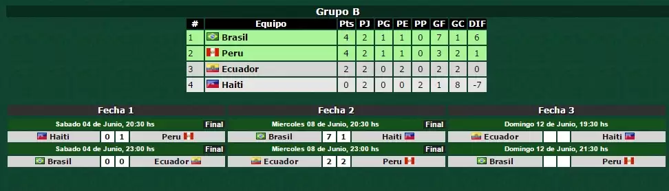Si Brasil empata 0 a 0 con Perú y Ecuador vence 1 a 0 a Haití, el Scratch se asegurará la primera colocación del grupo con 5 puntos (1PG, 2PE y 0PP – 7GF y 1GC). Pero además, Perú y Ecuador quedarán igualados en el segundo lugar con 5 puntos (1PG, 2PE y 0PP – 3GF y 2GC).