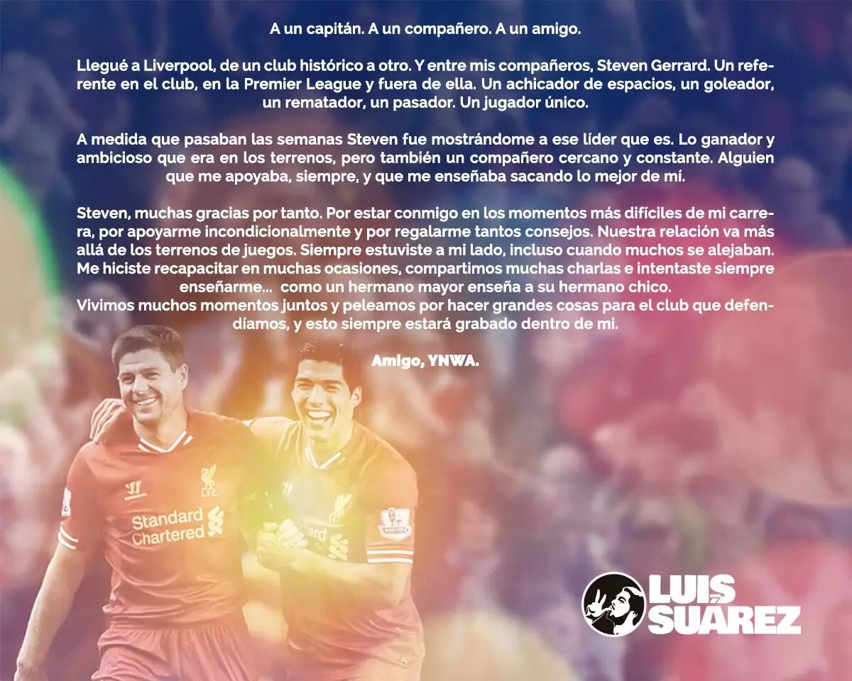 Sin embargo, dentro de todos saludos que recibió Gerrard, indudablemente se destaca la carta compartida en sus redes sociales, por la estrella del FC Barcelona, Luis Suárez, quien con sus más sinceras palabras termina tratando de hermano a quien tuvo como compañero durante varios años.