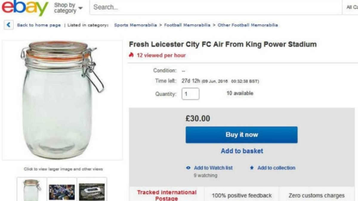 La creatividad no tiene límites. Y las avivadas tampoco. Un fanático del Leicester tuvo la peculiar idea de “enfrascar” aire del King Power Stadium, el estadio del Leicester, en la tarde que los Foxes se coronaron campeones de la Premier League, y ahora la vende por eBay.