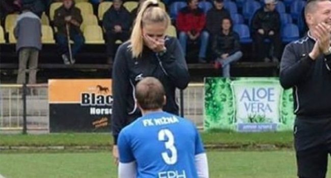 Durante el partido disputado entre el Nizna y el Tatranm, por la quinta división del fútbol eslovaco, el jugador Lubomir Vajecka le pidió matrimonio a la juez de línea Petra Lepackova, justo antes de iniciar el encuentro, ante la mirada de 400 espectadores.