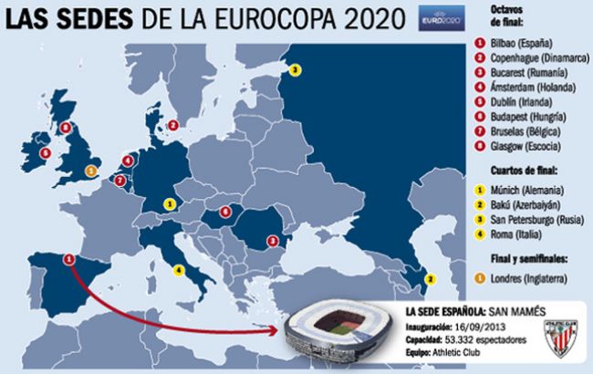 Alemania, Azerbaiyán, Bélgica, Dinamarca, Escocia, España, Inglaterra, Hungría, Italia, Irlanda, Holanda, Rumania y Rusia serán las sedes de la próxima edición de la Eurocopa, a disputarse en 2020.