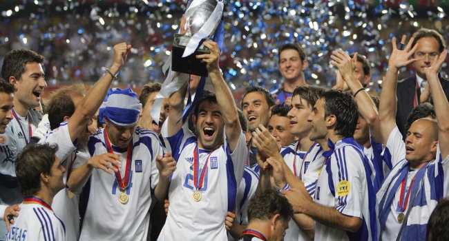 2004. Grecia gana en Portugal. En la fase de grupos de la Eurocopa ganó un partido y empató a uno contra España. Les sirvió para pasar segundos. Ya en las fases eliminatorias ganaron todos sus partidos por la mínima (1-0), incluyendo la final contra Portugal (la anfitriona) con el gol de cabeza de Charisteas.