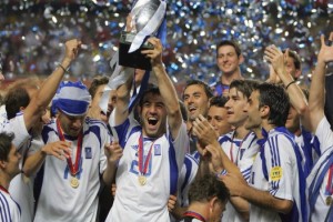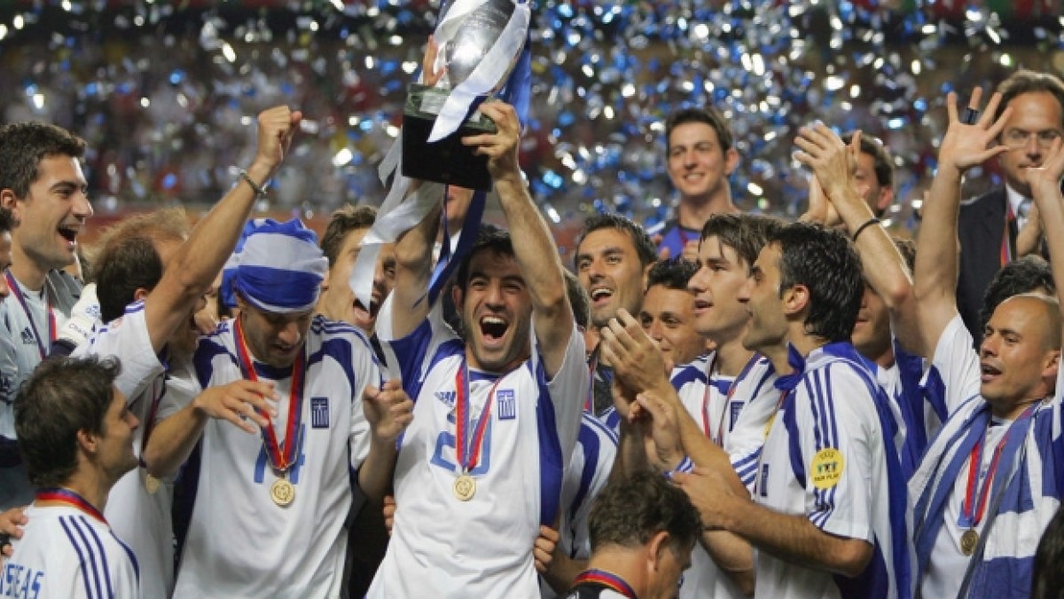 2004. Grecia gana en Portugal. En la fase de grupos de la Eurocopa ganó un partido y empató a uno contra España. Les sirvió para pasar segundos. Ya en las fases eliminatorias ganaron todos sus partidos por la mínima (1-0), incluyendo la final contra Portugal (la anfitriona) con el gol de cabeza de Charisteas.
