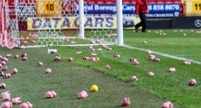Ambas parcialidades, enojadas con sus directivos, acordaron arrojar al campo de juego miles de cerditos de plástico. Los más de 3 mil muñecos hicieron que el encuentro en The Valley, Londres, se suspendiera por más de media hora.