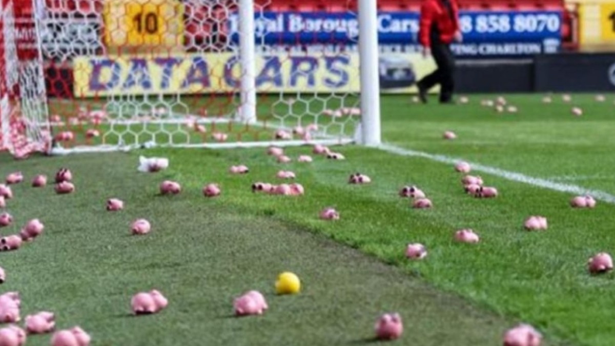 Ambas parcialidades, enojadas con sus directivos, acordaron arrojar al campo de juego miles de cerditos de plástico. Los más de 3 mil muñecos hicieron que el encuentro en The Valley, Londres, se suspendiera por más de media hora.