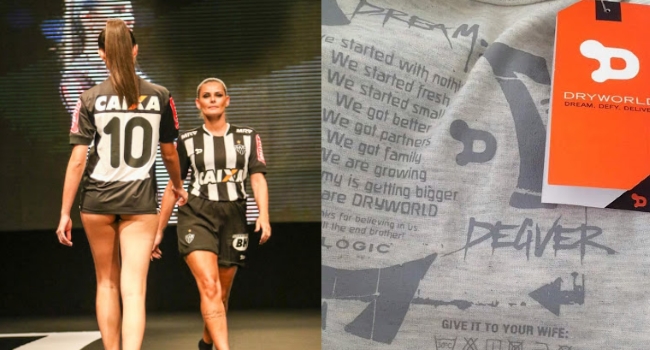 Se trata de Dryworld, la marca canadiense que pisará fuerte en el fútbol de Brasil, vistiendo entre otros al Atlético Mineiro. En el evento presentación de la nueva indumentaria del Galo, todas las críticas apuntaron a la decisión de Dryworld de que las encargadas de presentar la camiseta fueran modelos con poca ropa.