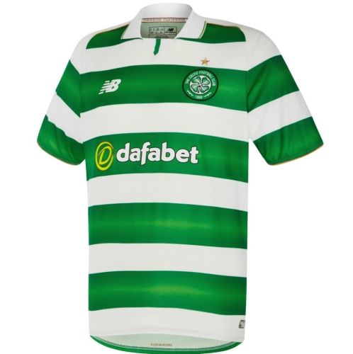 Siguiendo el diseño histórico, la prenda oficial de juego del Celtic FC mantiene las franjas horizontales verdes y blancas, con Dafabet como nuevo main sponsor en el pecho, y cuello tipo Polo.