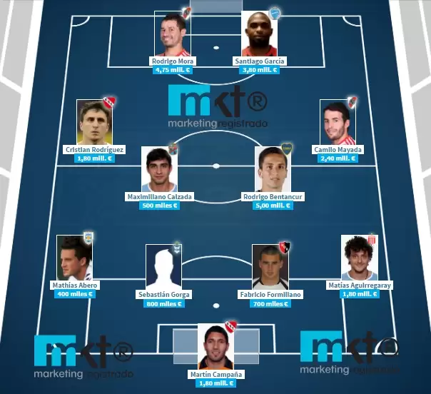 El mismo, tiene un valor de 23.7 millones de euros y está compuesto por jugadores de Independiente (x2), River (x2), Estudiantes, Gimnasia, Atlético de Rafaela, Boca, Arsenal y Godoy Cruz.
