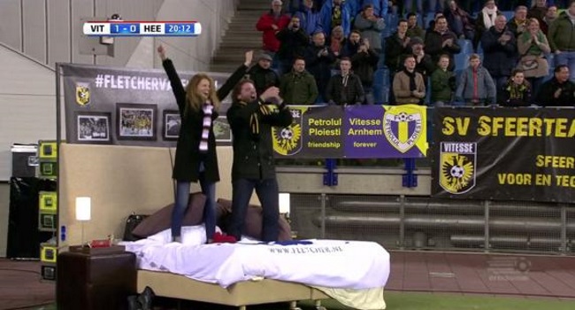 En el marco de los festejos del día de San Valentín, una pareja siguió el partido entre el Vitesse y el Herenveen, de la liga holandesa, en una cama ubicada dentro del estadio.
