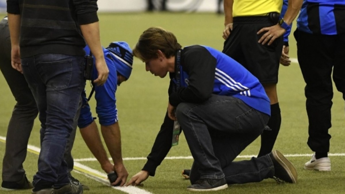 Rápidamente, un equipo de asistentes pintó las líneas incorrectas con aerosol verde, para luego pintar las nuevas.Si bien Montreal hace las veces de local en el Stade Saputo, para este encuentro había elegido el Estadio Olímpico de la ciudad.