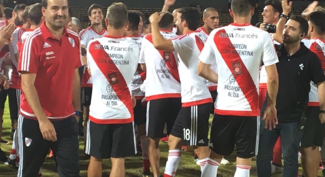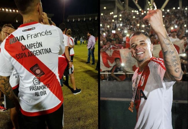 En los festejos, los jugadores del Millonario lucieron un diseño especial sobre su camiseta titular, con la leyenda “Pasaporte Aprobado” y “Campeón de la Copa Argentina”.