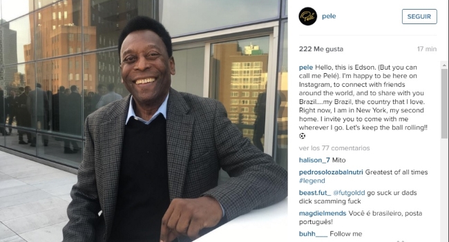 La leyenda del fútbol brasileño Edson Arantes do Nascimento, mejor conocido como Pele, acaba de abrir su cuenta de Instagram. Así, el 3 veces campeón de la copa del mundo, máximo goleador de todos los tiempos, ex jugador del Santos FC y el Cosmos de Nueva York, atleta del siglo XX, también conocido como "El Rey", publicó su primera imagen desde Nueva York. Además, Pelé invitó a sus aficionados a conocer más sobre su historia y a acompañarlo en su viaje alrededor del mundo.