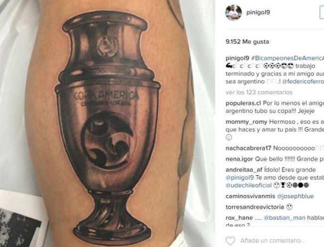 "¡Bicampeones! Trabajo terminado y gracias a mi amigo Federico Ferroni, aunque sea argentino", publicó Mauricio Pinilla en su cuenta de Instagram, mostrando el nuevo tatuaje en una de sus piernas: el trofeo de la Copa América Centenario.