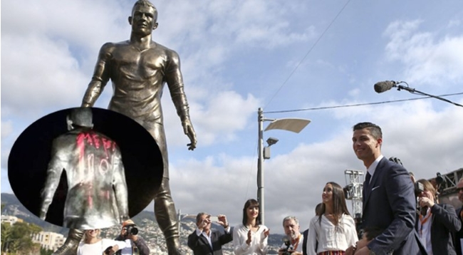 La estatua de Cristiano Ronaldo, creada el año pasado en Funchal, en la isla de Madeira, fue pintada en la noche del lunes, luego de que el argentino ganara su quinto Balón de Oro y superara, una vez más, al portugués.