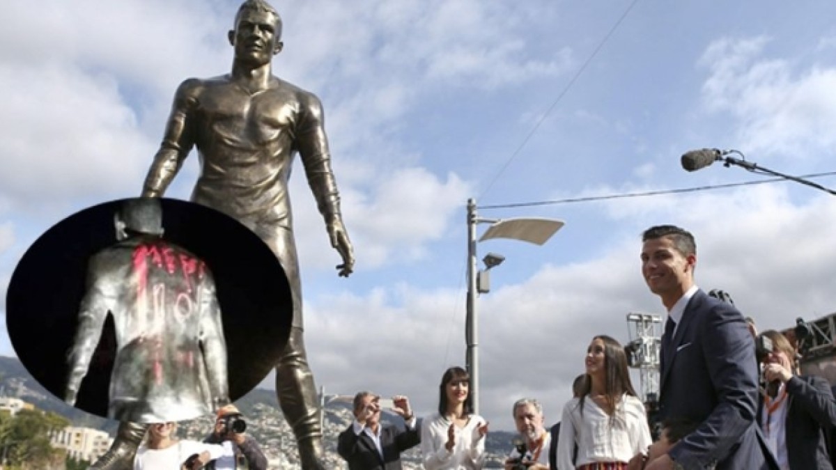 Pintaron el nombre de Messi en una estatua de Cristiano Ronaldo