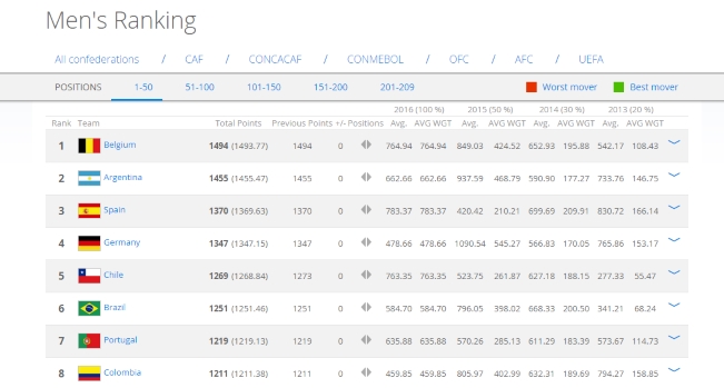 FIFA publicó el primer Ranking FIFA del año, con la presencia de Bélgica una vez más como la mejor selección del mundo. El conjunto europeo, amén de sus buenos rendimientos, aprovechó el flojo arranque de Argentina en las Eliminatorias para sostenerse en la cima.