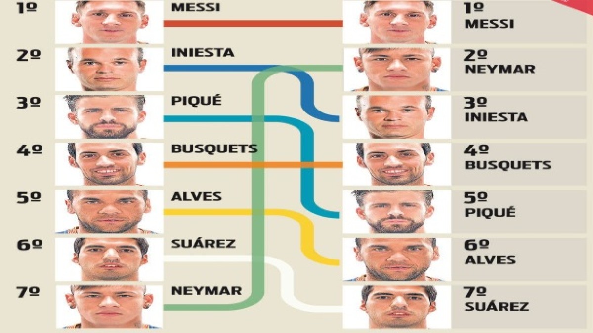 Andrés Iniesta, capitán y referente del Barcelona, se colocará un peldaño por debajo de Neymar, y uno arriba de Sergio Busquets.Con la última renovación de contrato, Lionel Messi, será el mejor jugador pago, no sólo del plantel, sino del mundo. El brasilero Neymar, quien ocupaba el séptimo puesto, escalará al segundo, mejorando considerablemente sus ingresos.