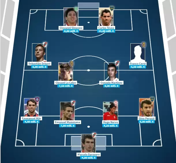 En la delantera, no podía faltar Carlos Tévez, el más valioso de todo el equipo, con un estimado de 15 millones de euros. Gio Simeone (8M) cierra el equipo.