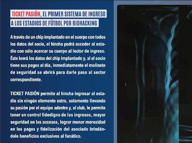 El Club Atlético Tigre presenta Ticket Pasión, el primer sistema de ingreso a los estadios de fútbol por BioHacking: a través de un chip implantado en el cuerpo con todos los datos del socio, el hincha podrá acceder al estadio con sólo acercar su cuerpo al lector de ingreso. Éste leerá los datos del chip implantado y, si el socio tiene sus pagos al día, inmediatamente el molinete de seguridad se abrirá para darle paso al sector correspondiente.