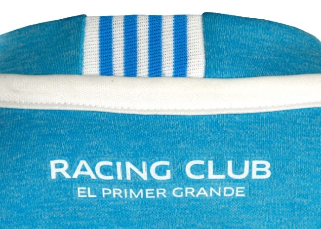 En cuanto a lo estético, la camiseta presenta un exclusivo diseño melange celeste. Centrado en el pecho se encuentra aplicado en bajo relieve el monograma con las siglas RC, primer emblema de la historia del club. En el interior del cuello se exhibe el claim oficial que identifica al club: “El primer grande”. Sumado a esto, en los dos costados de la camiseta se observa “R+” (Racing Positivo), un símbolo optimista que el plantel profesional adoptó a partir de una iniciativa de los hinchas en las redes sociales."