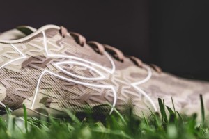 El calzado combina colores claros y marrones, realizado en material sintético y con una suela especialmente creada para que los jugadores se mantengan firmes en terrenos blandos.