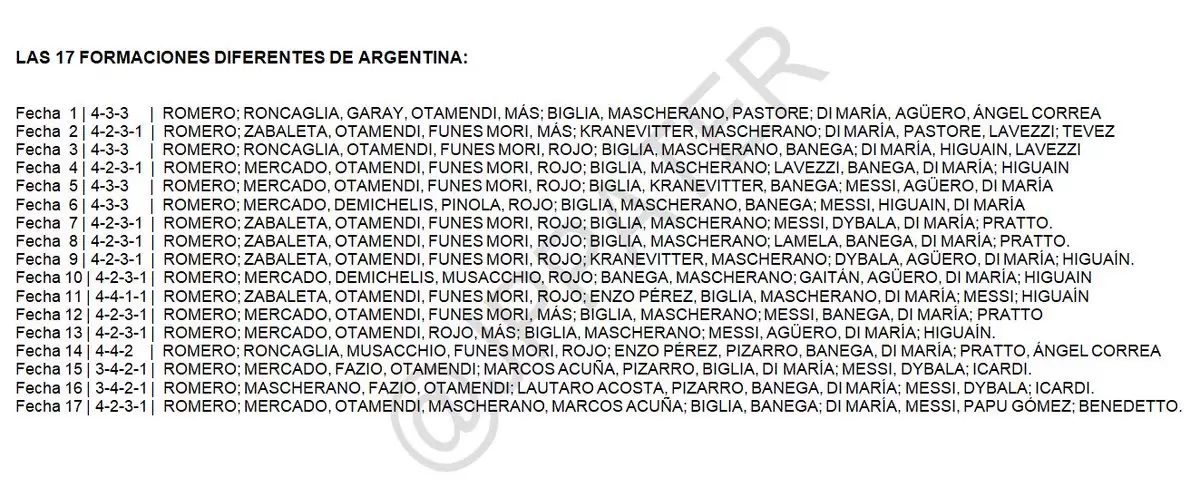 En el cierre de las Eliminatorias, Argentina presentará lo que será el décimo octavo equipo distinto -así como su dibujo táctico- en lo que va del campeonato en una clara muestra de lo que ha sido la irregularidad de jugadores y tres entrenadores distintos desde hace dos años.
