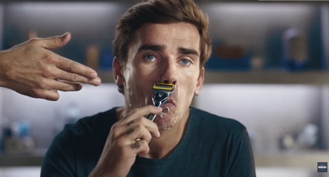 En la primera parte de un comercial que consta de dos capítulos, se puede ver a Antoine emulando las muecas que realiza normalmente un hombre a fin de poder alcanzar todos los sectores de su cara para afeitarse correctamente, mientras que en el segunda, con la ayuda del nuevo producto, Griezmann demuestra la comodidad de la afeitada sin necesidad de gestos.