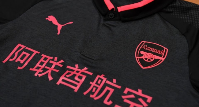 En una novedosa estrategia de marketing por parte de su Departamento de Publicidad y Diseño, el Arsenal FC estrenó esta semana su nueva línea de camisetas oscuras con detalles en magenta fluorescente, con la novedad de traducir su patrocinio al idioma del país en donde la utilizaron.