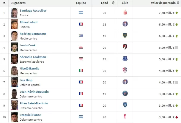 El uruguayo Rodrigo Bentancur, de Boca Juniors, aparece tercero, cerrando el podio, con 6 millones de euros.