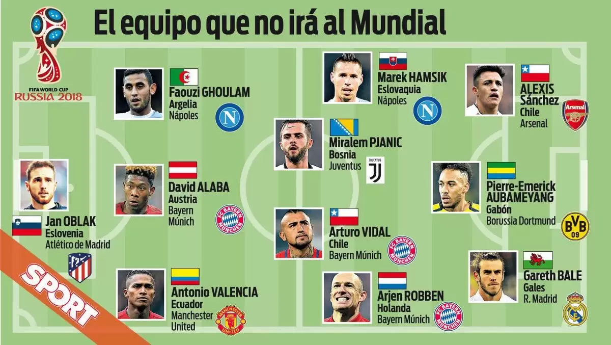 A falta de un puñado de encuentros para definir a los nueve clasificados restantes de cara a la próxima Copa del Mundo, el Diario Sport de España se animó a elaborar su propio “Once Ideal” de jugadores que no irán a la máxima cita mundialista.