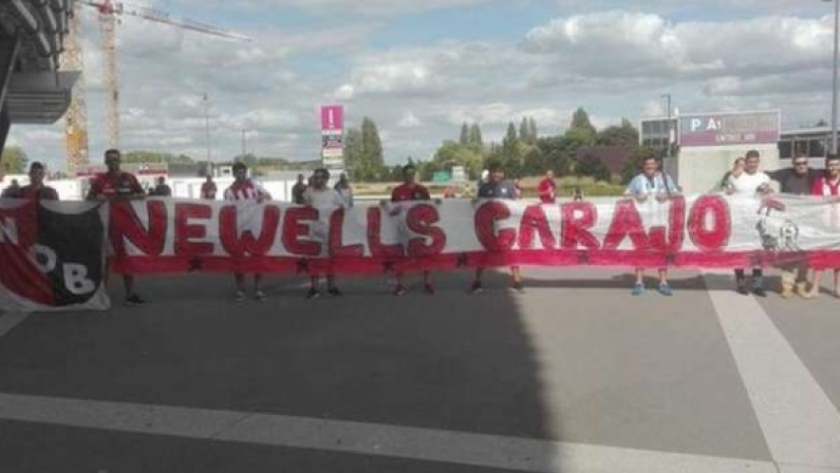 Con el logo y los colores de la institución, un grupo de hinchas de la Lepra se animaron a ingresar al escenario francés con una bandera que llevaba la frase inmortalizada del entrenador: “Newell’s carajo”, además de una precaria ilustración que retrata aquel recordado momento.