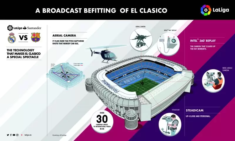 Con el Santiago Bernabéu como escenario destinado para albergar a varios de los mejores jugadores de mundo, se proyecta implementar más de 30 cámaras en 4K-HDR con el objetivo de hacerlo llegar a los casi 650 millones de espectadores repartidos entre los 182 países que recibirán la señal del encuentro.